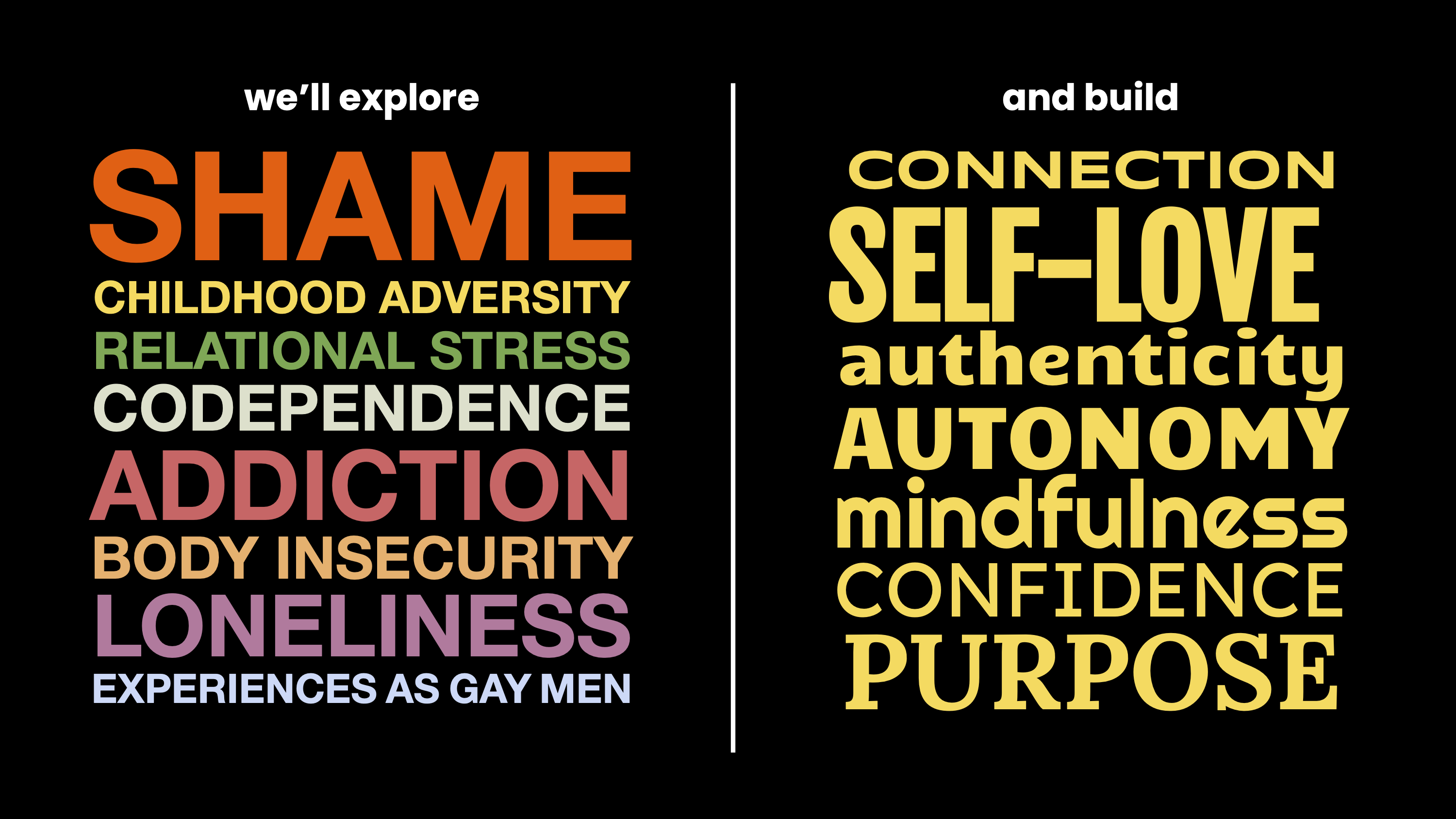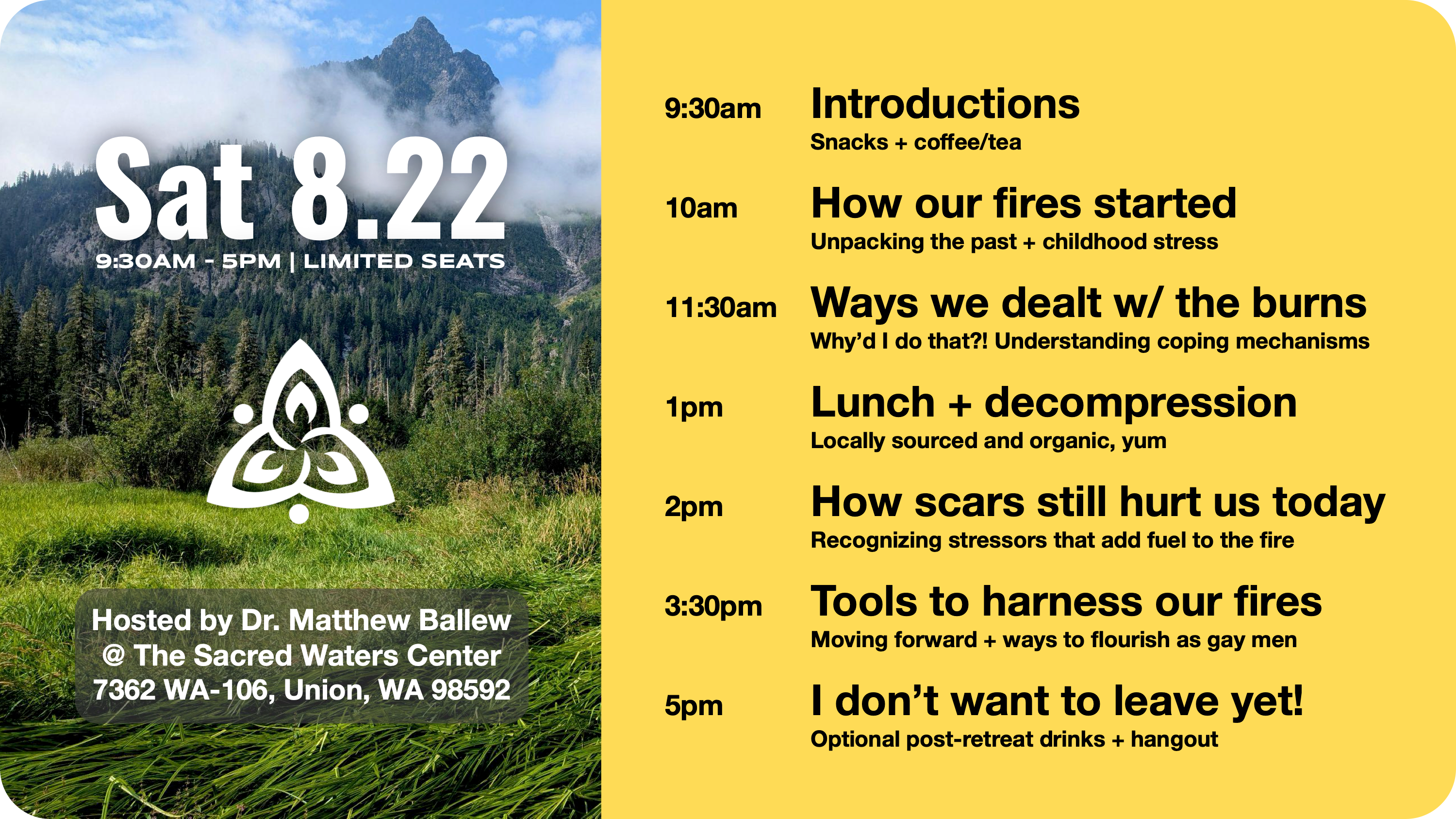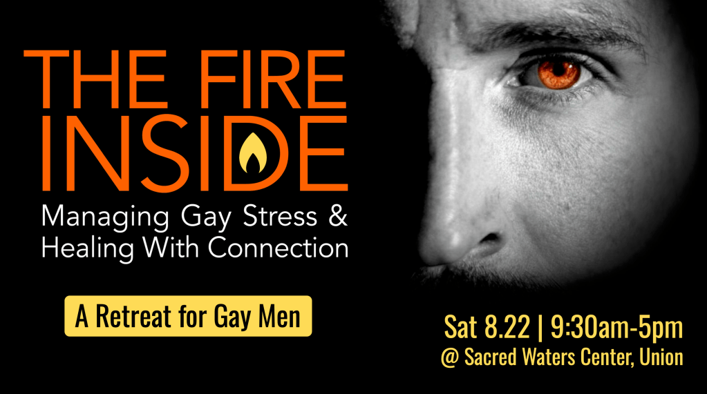 It is not a flaw or something to extinguish. It is the natural result of growing up having to mask as a way to feel safe and belong. This retreat will help you nurture the unique fire inside of you. We’ll explore how these fires started, and how they’ve affected our behaviors, relationships, and well-being. Ultimately, you’ll walk away with tools to manage the stress that you’ve uniquely experienced as a gay man, and ways to flourish through improved relationships—to yourself, other people, and the world around you.